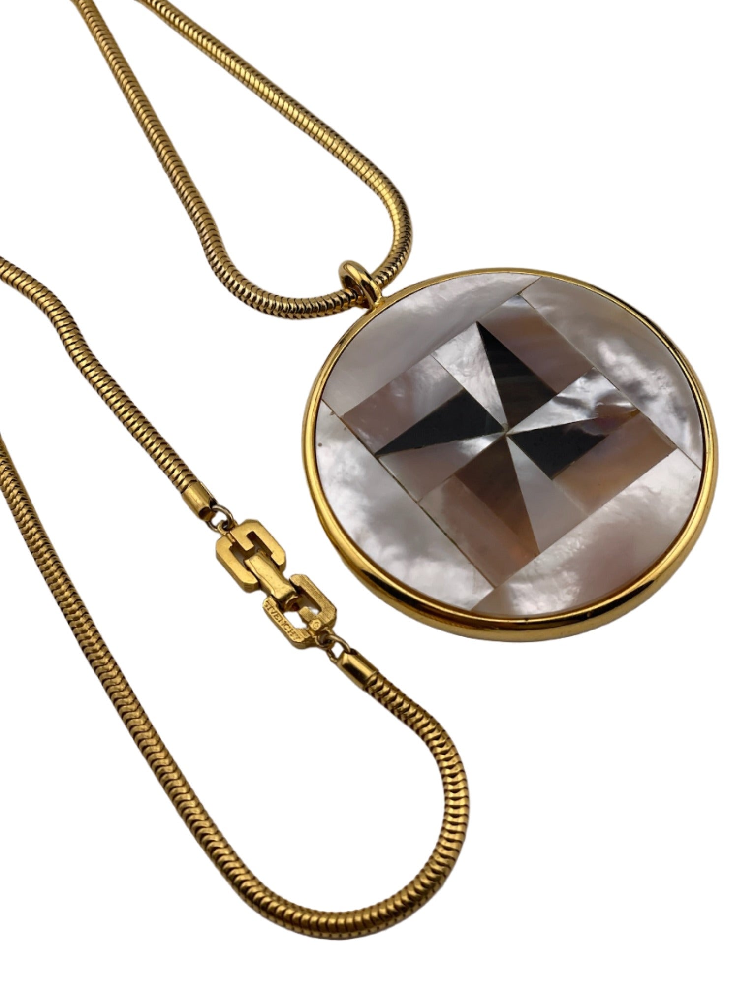 - Notes: Oversized necklace with snake chain, gold plated, mother of pearl mosaic