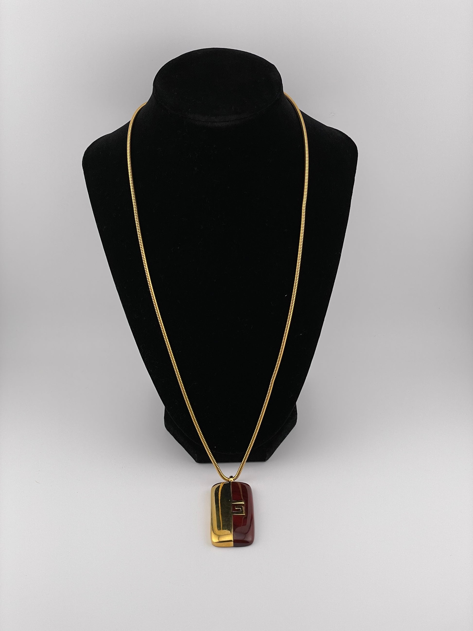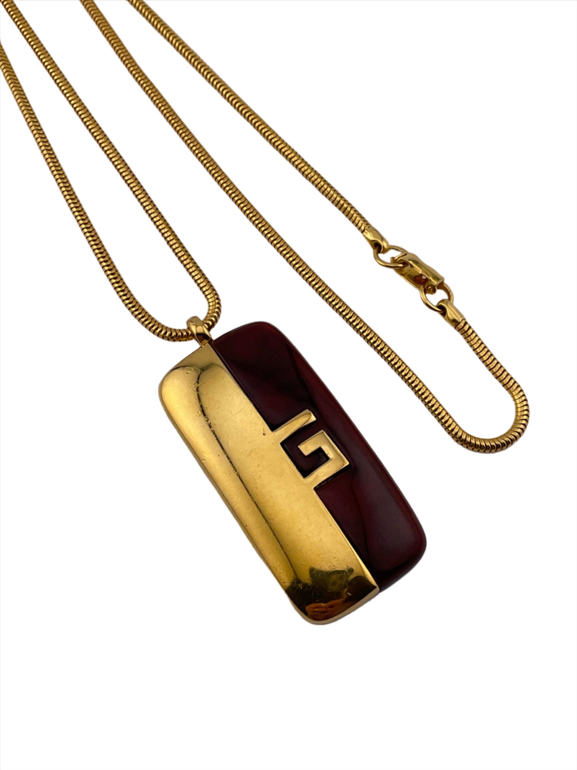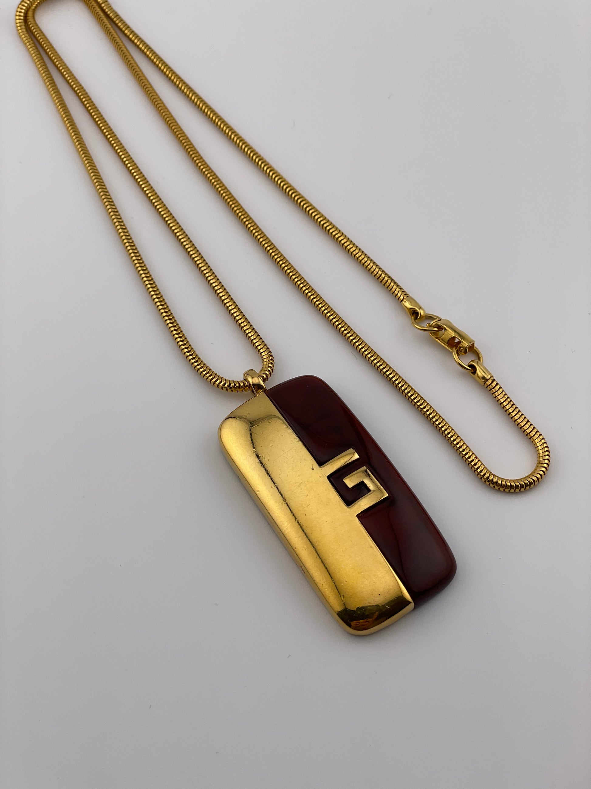 - Notes: Gold plated snake chain with rectangular brown resin and gold pendant with G logo