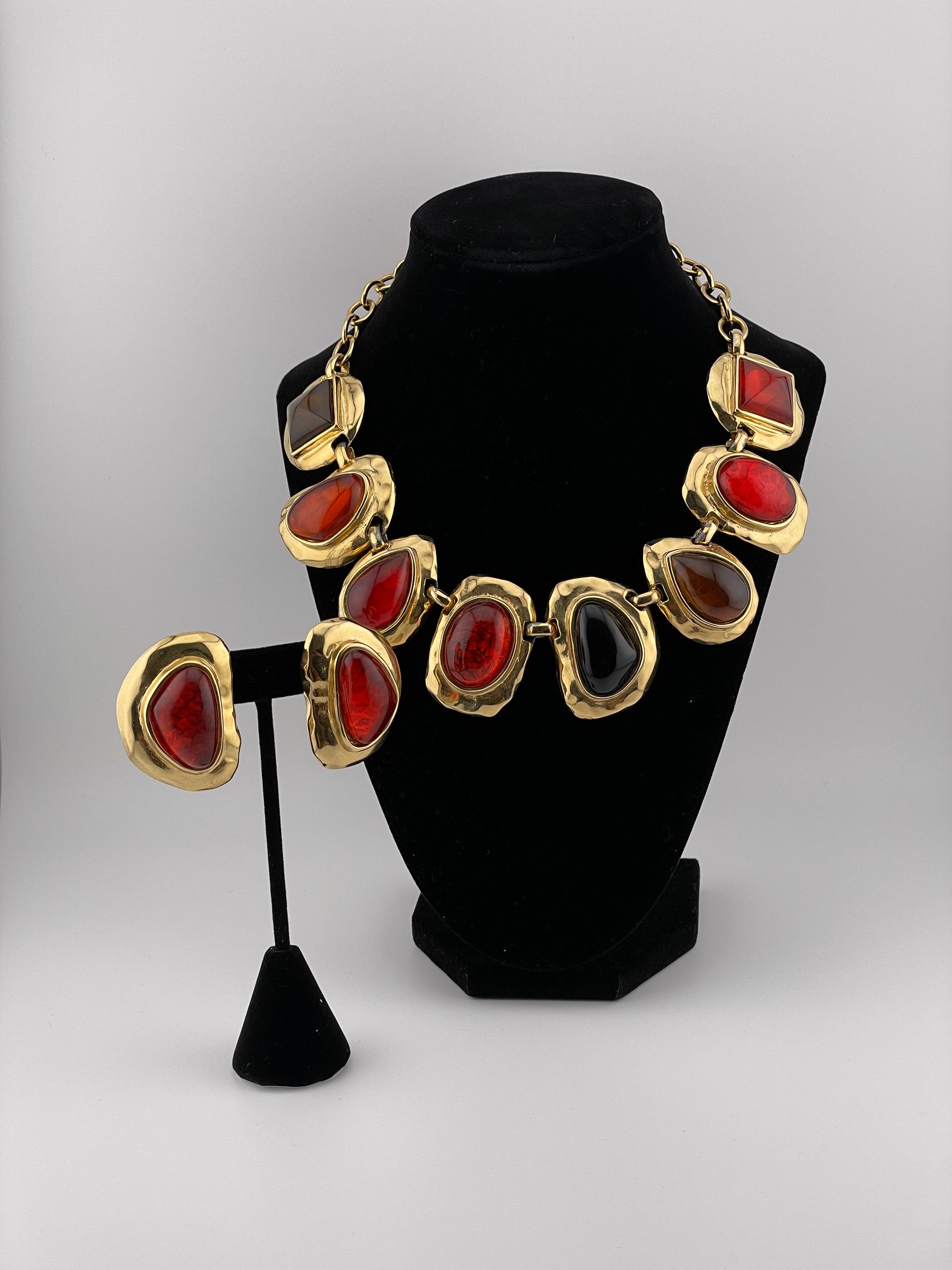 - Notes: Chunky clips with red lucite, gripoix style, gold plated. Can be purchased with matching necklace and/or bracelet.