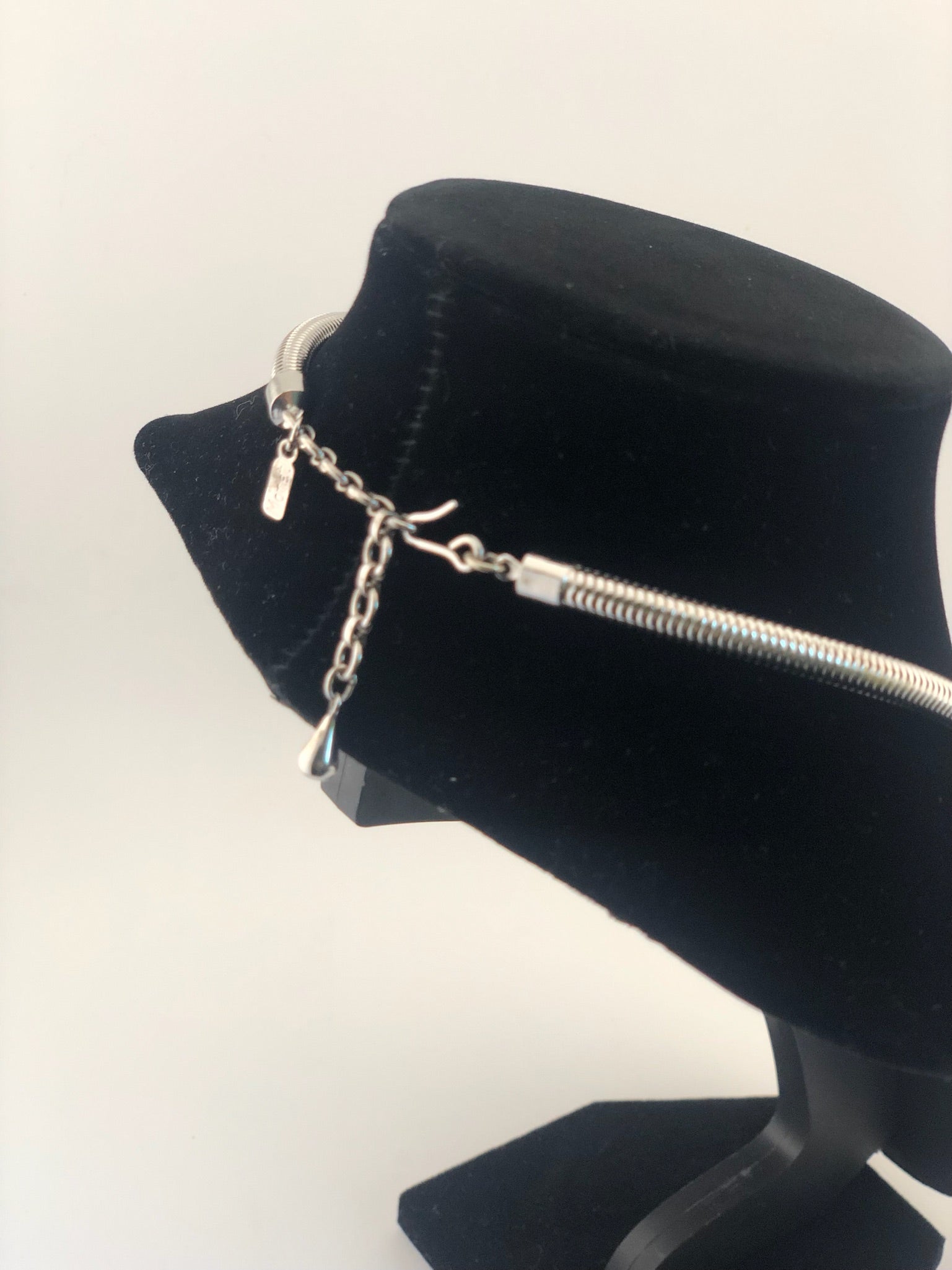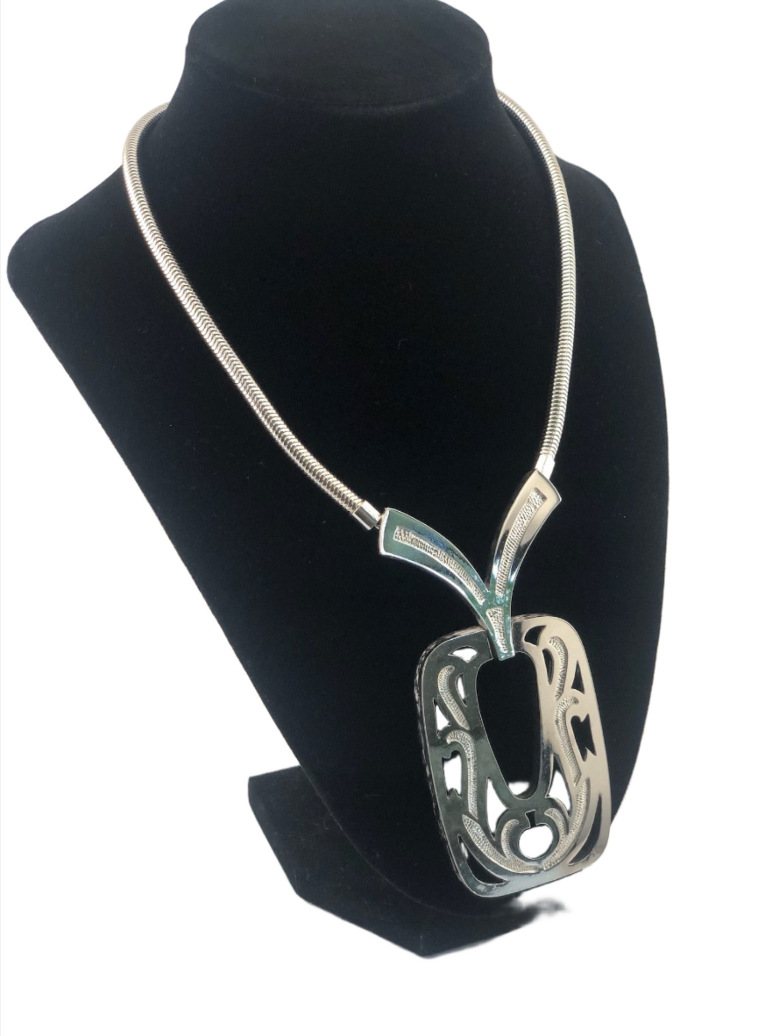 - Notes: Silver tone snake chain, texturized large cut out pendant.