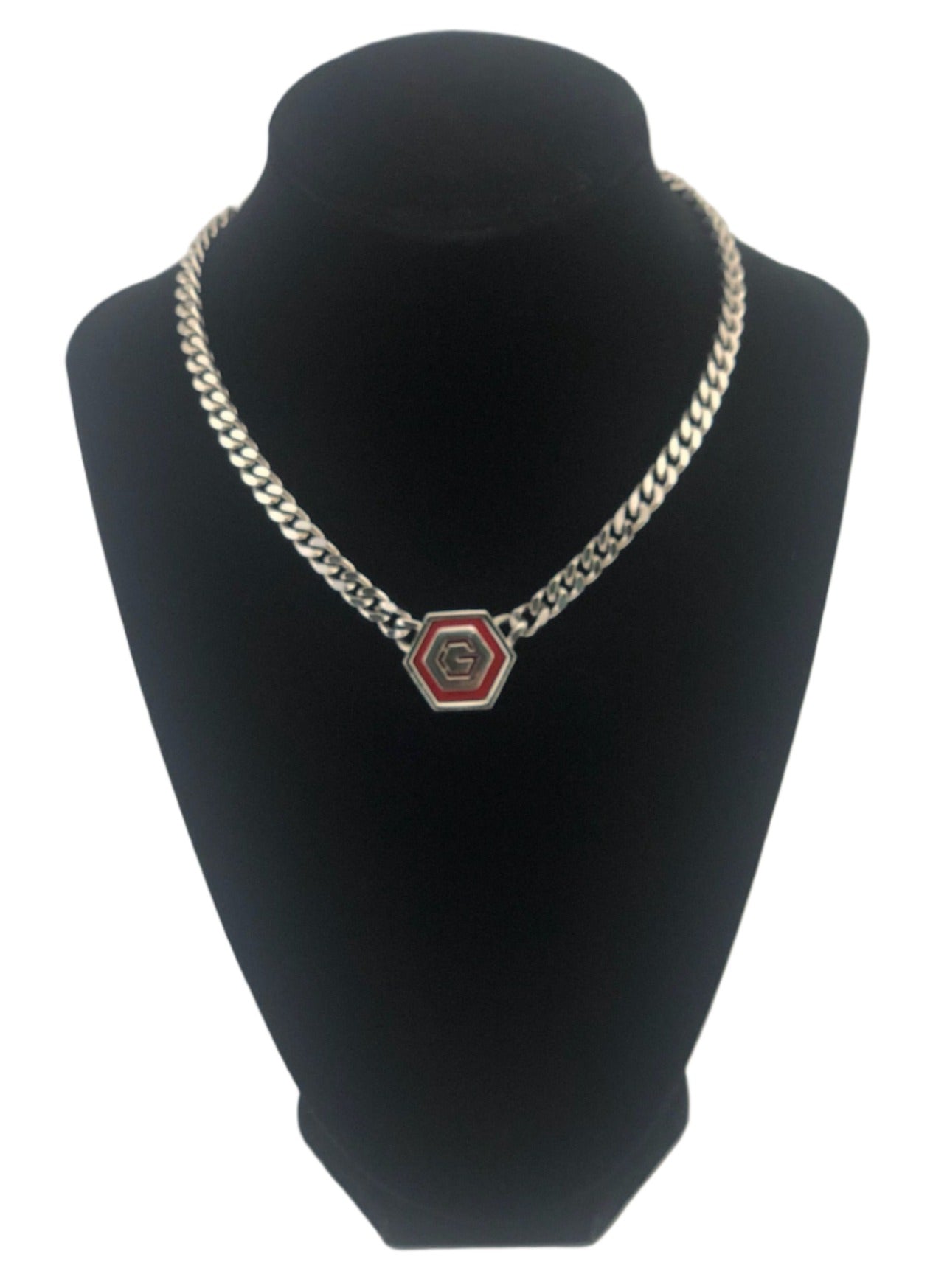 - Notes: Silver tone chain with geometric logo pendant with ruby enamel, GG clasp.