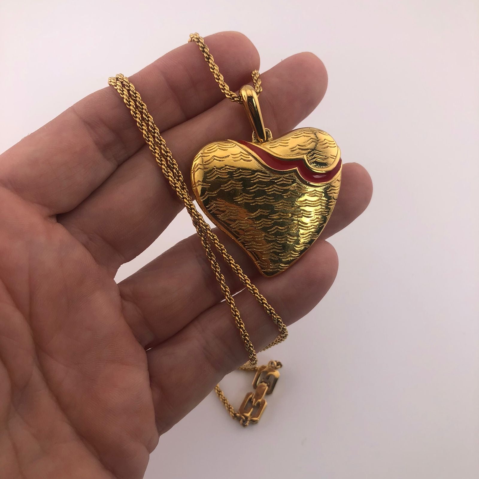 - Notes: Gold tone with red enamel accent heart shaped pendant, with GG logo snap on the back