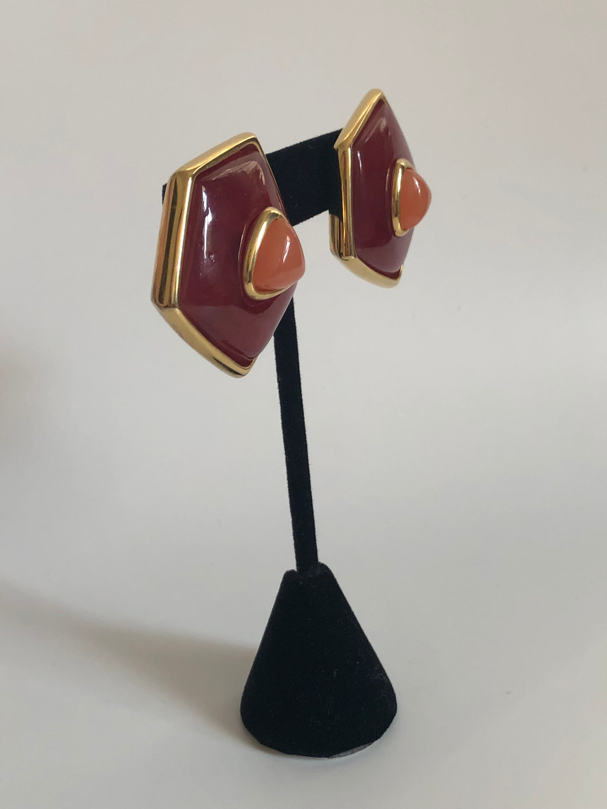 Vintage LES BERNARD large earrings clip on red orange gripoix style