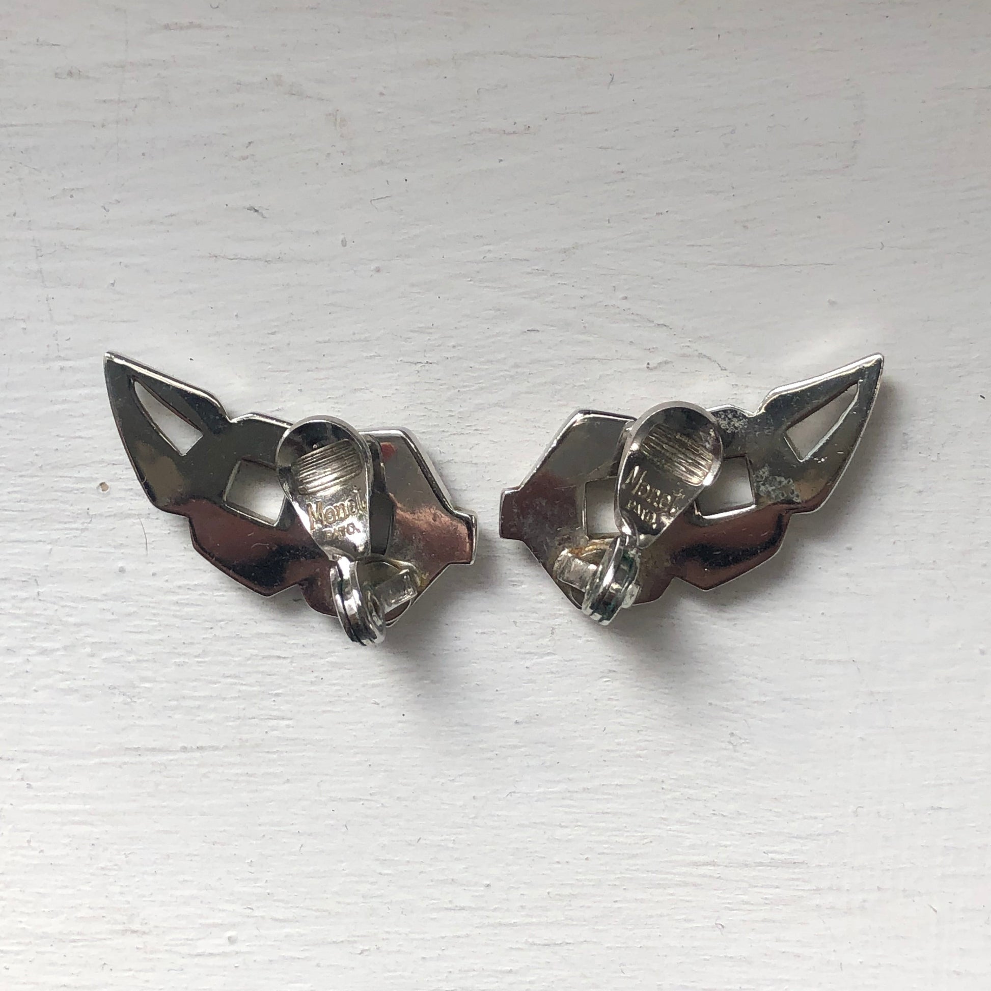 - Notes: vintage earrings clip on from early collection MONET ,1949 / silver plated greek ornament / has weight / marked