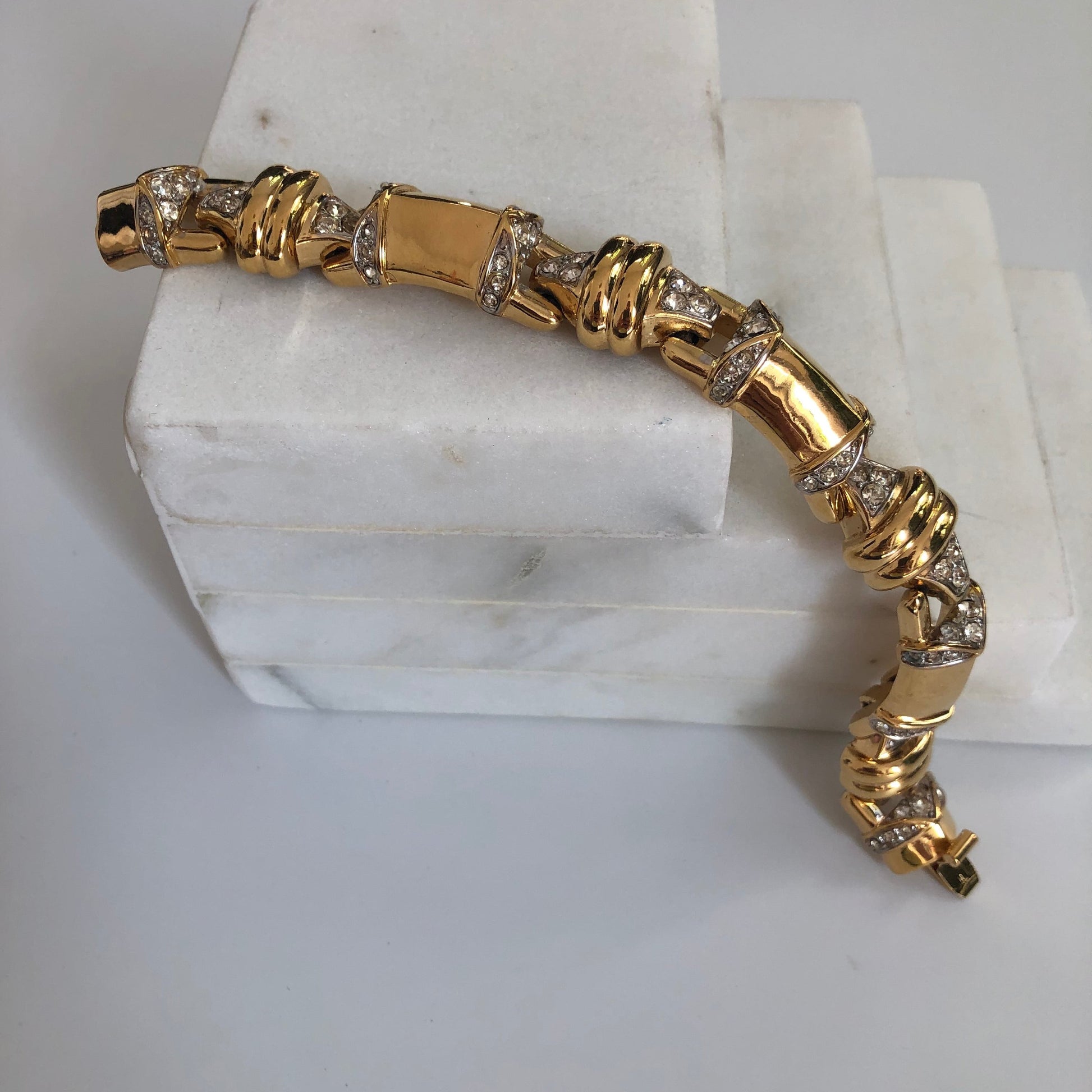 - Notes: vintage bracelet , chunky gold plated links by nina ricci ,80s/ decorated clear rhinestones / signed on the back