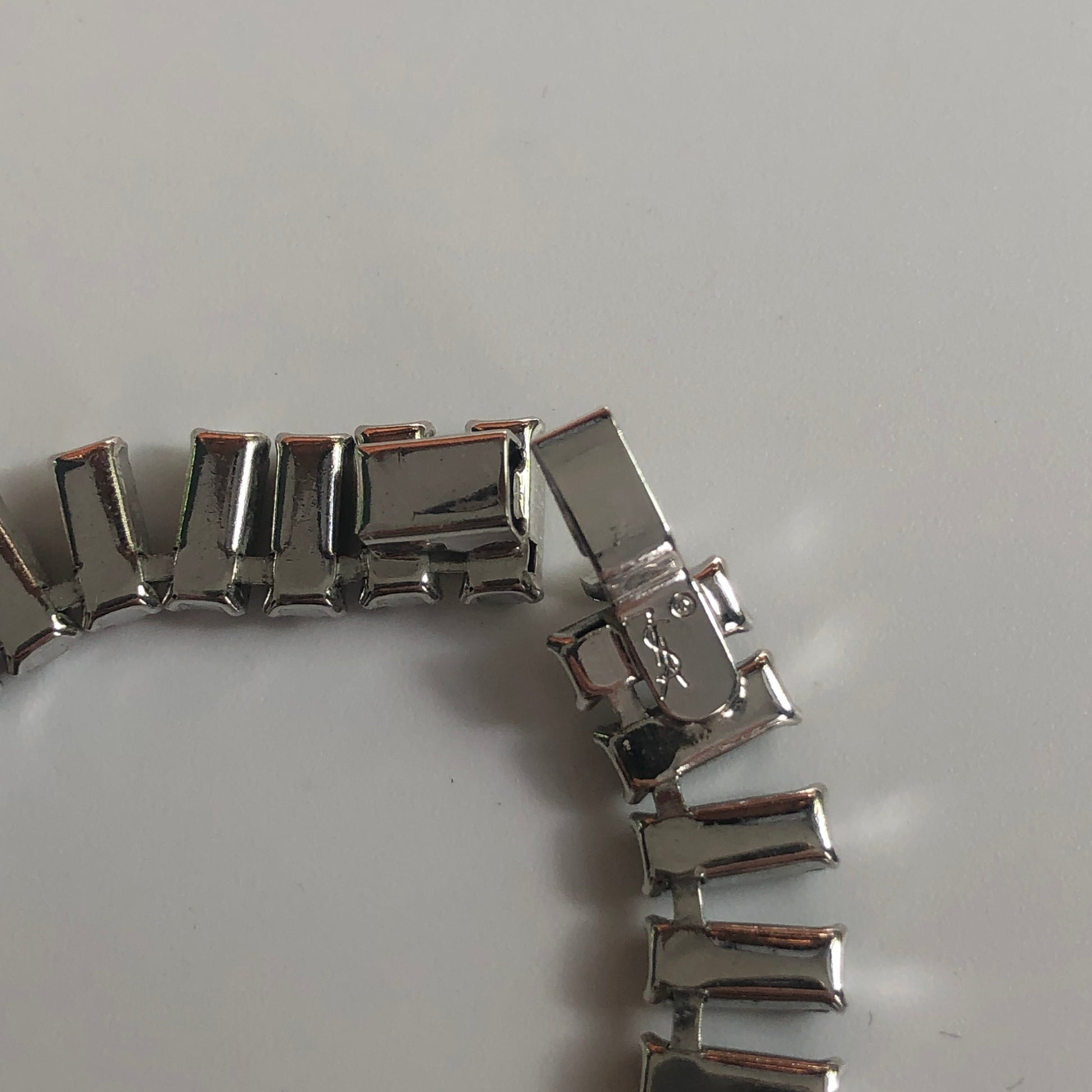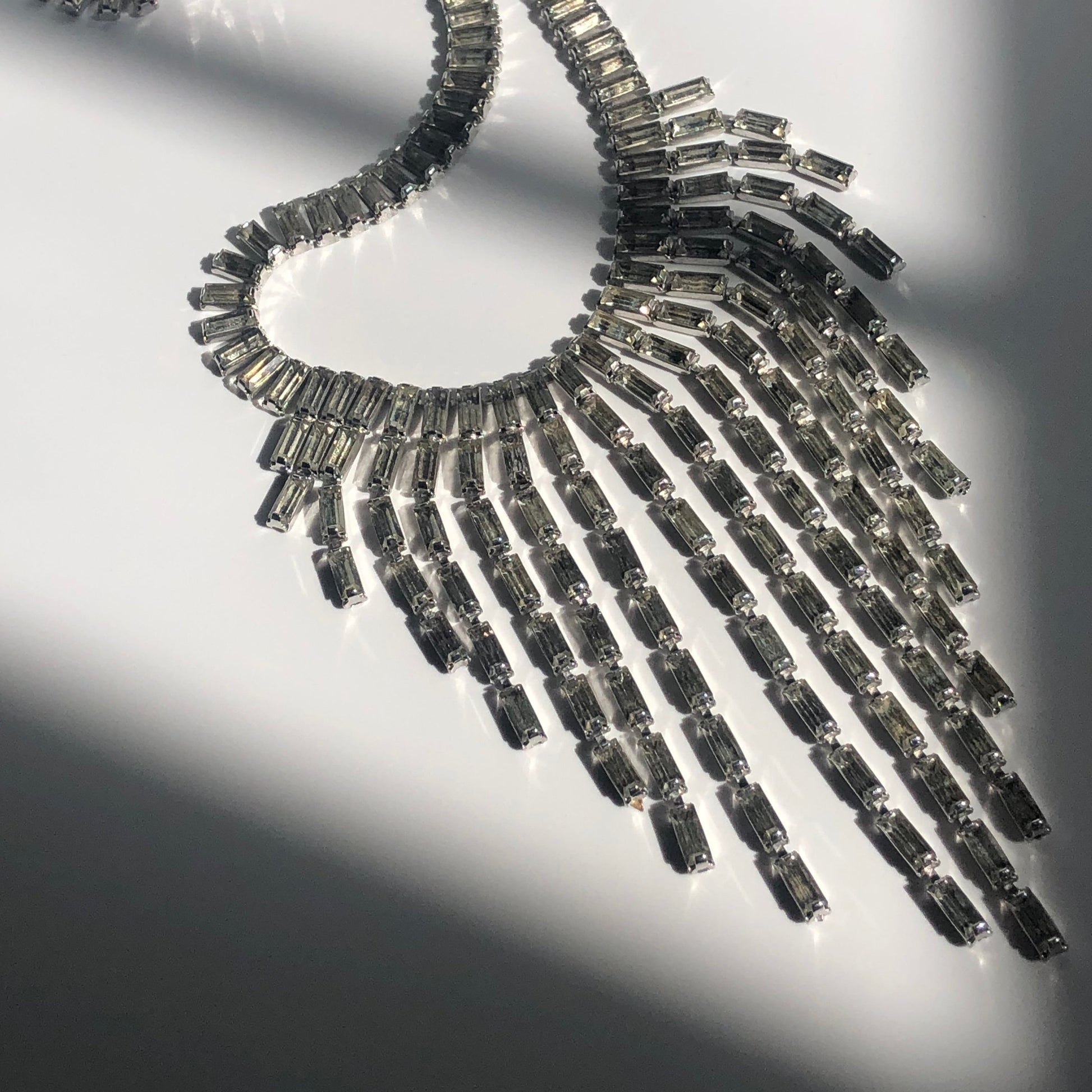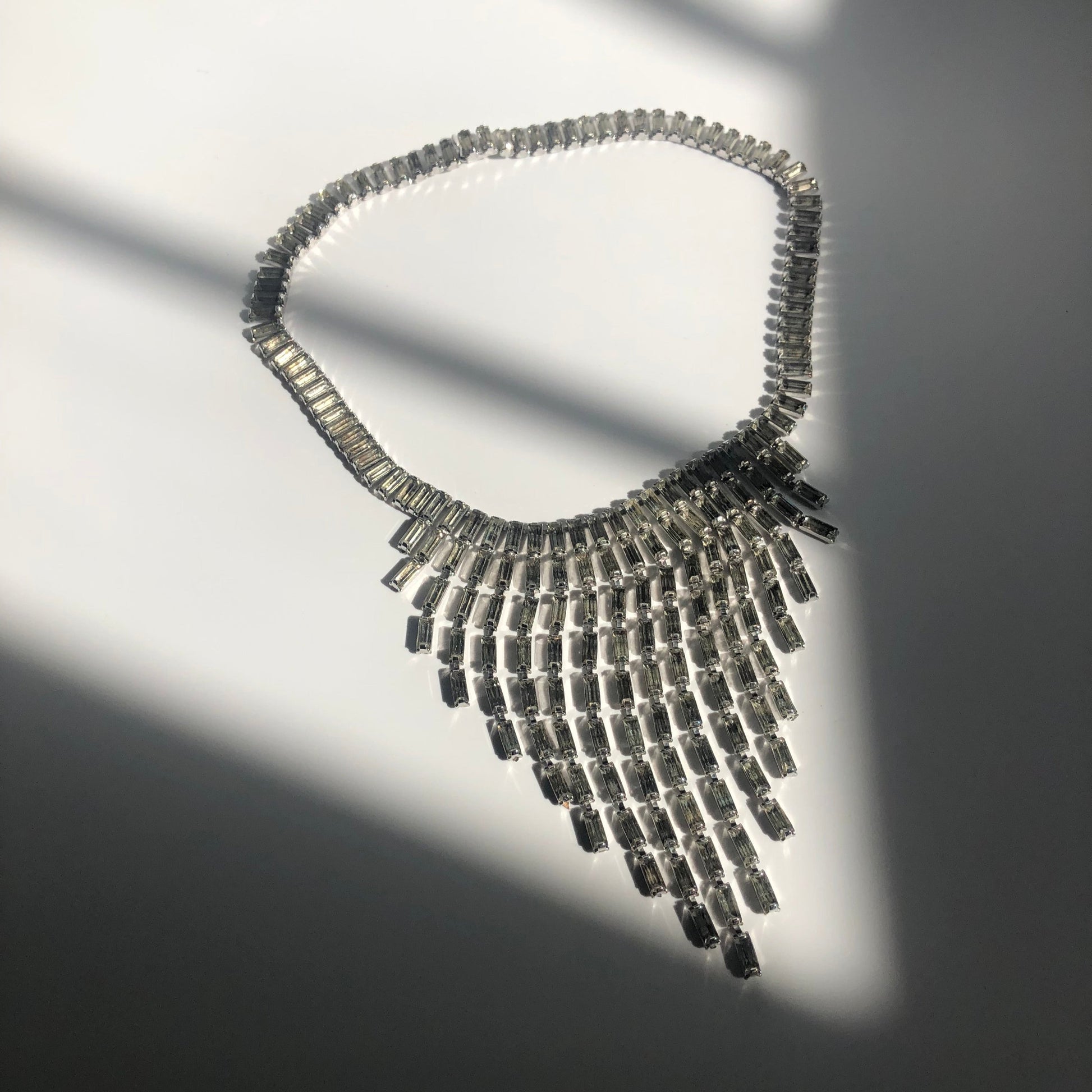 - Notes: stunning waterfall necklace by Yves Saint Laurent, 70s / silver tone metal / decorated clear sparkling baquette rhinestone/ signed on the back logo